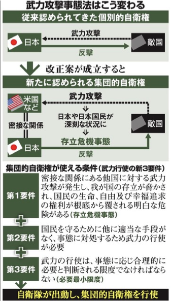 如果通過了新的法律,行使集體自衛權只需要符合上述「武力行使三要件[2]」的第一要件「存立危機事態」、以及另外兩項要件(比例原則與必要原則),日本就可以在海外進行戰爭。
