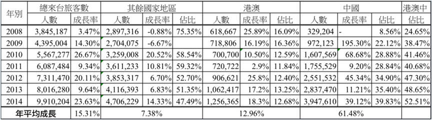 根據觀光局統計,來台外籍旅客,由2008年約384萬人次,到2014年的991萬人次,大幅成長了158%,其中隱藏令人憂心的數據是,中國旅客從開放初期入境旅客的8.56%,膨脹到2014年的39.83%,港澳中合計,竟佔去台灣入境旅客的52.51%!而其餘國家地區的旅客,僅僅只佔整體入境旅客的47.49%,甚至逐年下滑中。顯示台灣觀光旅遊業,依賴單一國家、單一市場(也就是中國)的窘境,已經越來越嚴重了。