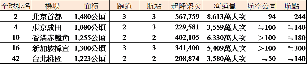 依據國際機場理事會的統計,2014年全球廿大機場分別是1.亞特蘭大、2.北京首都、3.倫敦希斯羅、4.東京成田、5.洛杉磯、6.杜拜、7.芝加哥、8.巴黎戴高樂、9.達拉斯、10.香港赤鱲角,桃園機場以3,580萬人次排名第42名。若以全球前廿大的四座亞洲國際機場,來跟桃園國際機場來做一個比較: