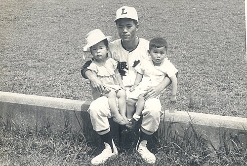 我家相簿有一張老照片,老二在台中棒球場比賽前,抱著我三歲妹妹和隔壁王家男孩合影,他當年球技開始進入巔峰。後幾年,就比較少在台中看他表現了,可能都在台北或高雄出場吧!他僅當過一次國手,不像周阿海、譚信民那麼有名。