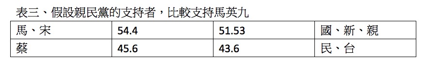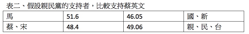 也就是說,不但大家都把親民黨歸納成泛藍,就連親民黨的支持者,對馬英九的支持度恐怕還是高於蔡英文,這代表親民黨的5.5%與宋楚瑜的2.8%間約2.7%的落差,大概多是投給了馬英九,也就是棄保效應的發生是棄宋保馬。