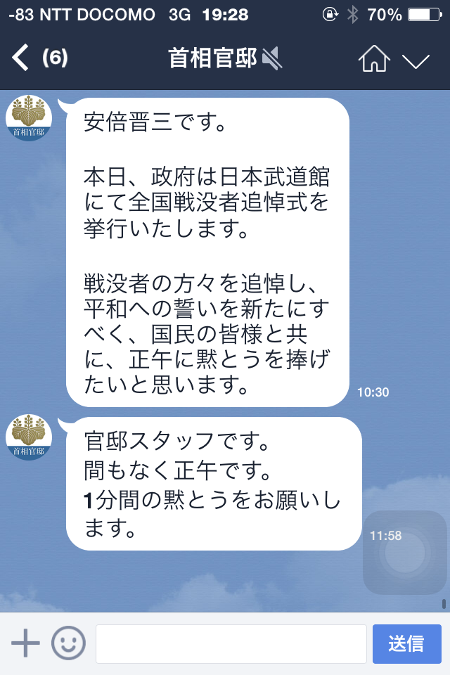 當然我跟安倍晉三沒有深交,這是首相官邸的官方Line8月15日傳來的訊息,同時也提醒人們,中午時分保持一分鐘緘默,因為這天是日本終戰紀念日。日本首相安倍晉三當日上午於日本武道館進行追悼儀式,並且發表了談話,字裡行間中有值得玩味之處,許多前輩的文章已經做出各種分析與解釋,那麼我就來說說,身為一介外國人,我在日本看到了什麼。