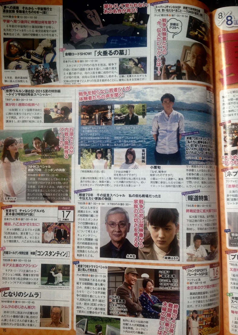 翻開電視週刊,掛上「終戰70年」title的特別節目、以戰爭為題材的連續劇、動畫都在最近這幾周的家中小螢幕輪番上陣。有重新再播送的電影《永遠的0》、有以在原子彈投下後,廣島的少女們為了讓路面電車運行的熱血故事,有描寫特攻隊與妻子之間的愛情劇碼,也有以訪談報導、分析解說為主的特別節目,這些節目的特點在於它們都細細描繪了當時小人物們的人生故事,以及它們都打出了這是給對戰爭不了解、沒在教科書上獲取戰爭概念的人觀看的slogan。