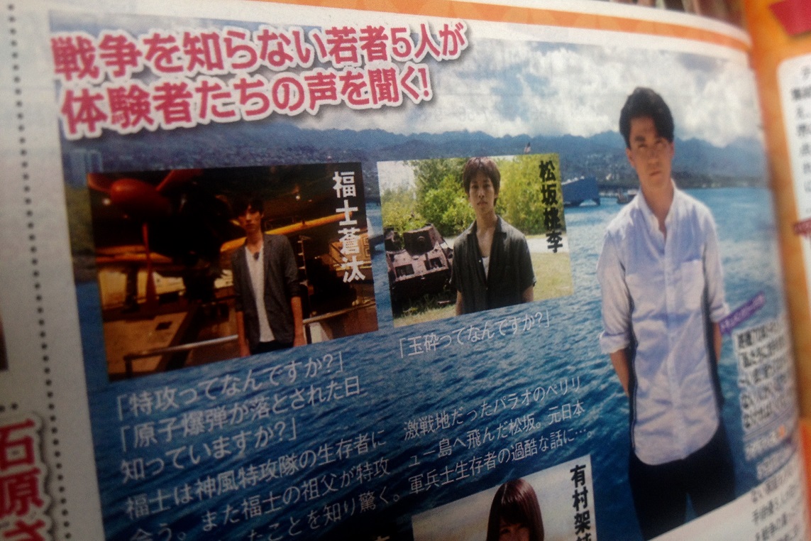 以富士電視台8月15日播出的特別節目《終戰70年紀錄片企劃》為例,邀請了演員小栗旬到夏威夷和長野縣,訪談在珍珠港事件時的飛行員;祖父曾經是神風特攻隊候補的演員福士蒼汰,則是去訪問了當時的生存者;女演員有村架純,則是到沖繩去和經歷過戰爭時代的老奶奶見面。而日本電視台的《教科書上學不到的戰爭》節目則是由偶像團體嵐的成員櫻井翔和老牌主持人池上彰一同主持,池上彰作為新聞節目的老面孔,可說是日本民眾普遍接受的評論者,在深夜新聞節目做了將近十年的櫻井翔,也以知性派偶像之姿,展現出對年輕粉絲的號召力,透過這些銀幕上受人憧憬的男女藝人、演員,硬調的戰爭議題,企圖引起更廣泛年齡層的注意,順道一提,《教科書上學不到的戰爭》在關東、關西地區皆拿到約13%的收視率。