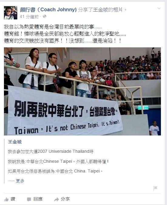這兩天,球迷在瓊斯盃球場觀眾席拉出「別再說中華台北了,台灣就是台灣」布條,現任富邦籃球隊總教練、前男籃國手顏行書,在臉書上表示球場「聖地淪陷」,希望「政治歸政治、體育歸體育」。此言一出馬上引發大亂鬥,網友說顏自我矮化、觀念錯誤,顏說感受到網路霸凌、球員也想穿著印有台灣的球衣出賽。