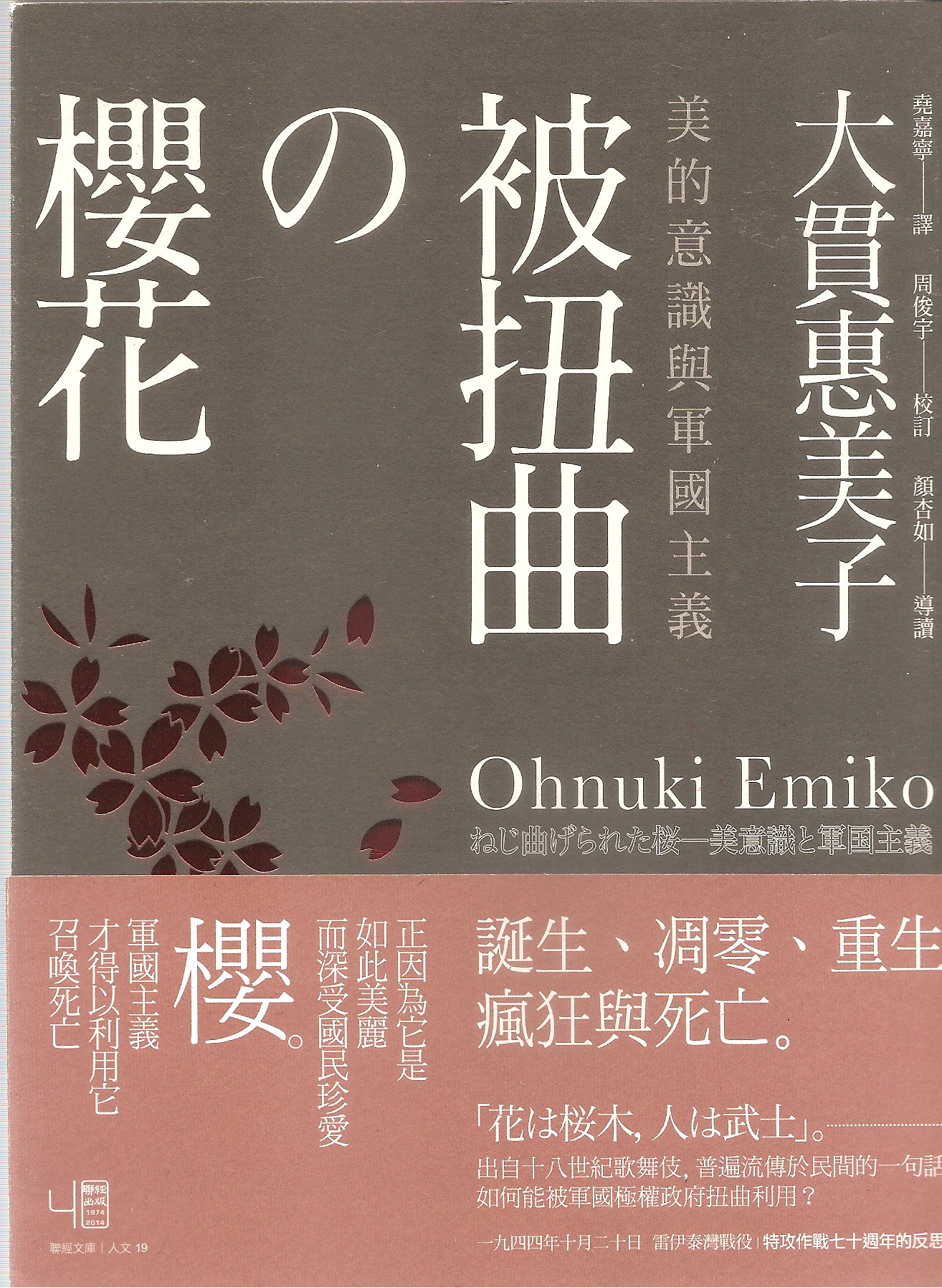 再就打破向來對日人的刻板印象來說,大貫惠美子綰合文化人類學、民俗學與歷史學成就的《被扭曲の櫻花──美的意識與軍國主義》,殊值一讀。若說潘乃德之書是外部取徑、捨異求同的西方主義立場,那大貫惠美子則深入肌理、多元發光。她以豐富的史料呈現櫻花的多義:遠古時代是和農耕文化的宇宙觀貼合,平安時代則透顯貴族文化的「物哀」之情,中世紀以迄江戶時代,櫻花演變成日本獨具的文化象徵;然而近代天皇制昂揚的過程中被人為的扭曲,由文化而政治,成為「為天皇即國家而犧牲」的意識形態,其極致就是神風特攻隊。