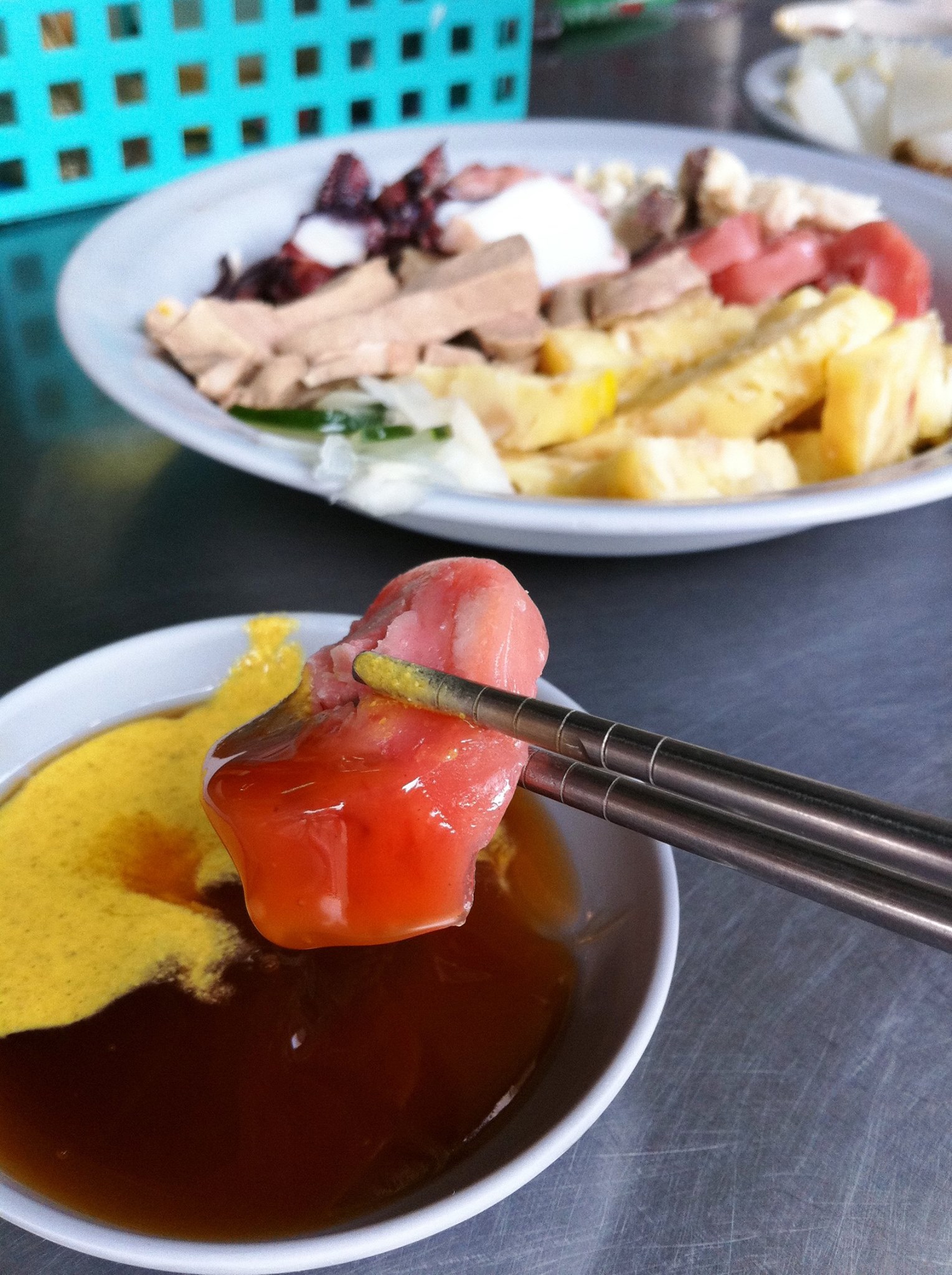 這道台南府城獨樹一格的街頭小吃,有著古早時代小吃攤推車沿街叫賣的歷史印記。廟口廣場前、老樹綠蔭下、港口碼頭邊,饕客們靠胃囊自動咕咕叫提醒,聞聲、聞味自動聚集。攤車老闆望著一張張饑腸轆轆臉孔、心中自有斤兩份量價錢,刀功俐落切下、節奏清晰分明,儼然神聖儀式,變化出融合糯米腸、香腸、菜頭或是豬心的大小盤組合。然後三五好友,捧著盤盤「香腸熟肉」,隨地而坐、配著「祕露」(啤酒)或「晃頭仔」(米酒),天南地北、無所不聊,偶爾挾帶幾句三字經語助詞。吃飯皇帝大、人生不如意、生活甘苦淚,通通放一旁!