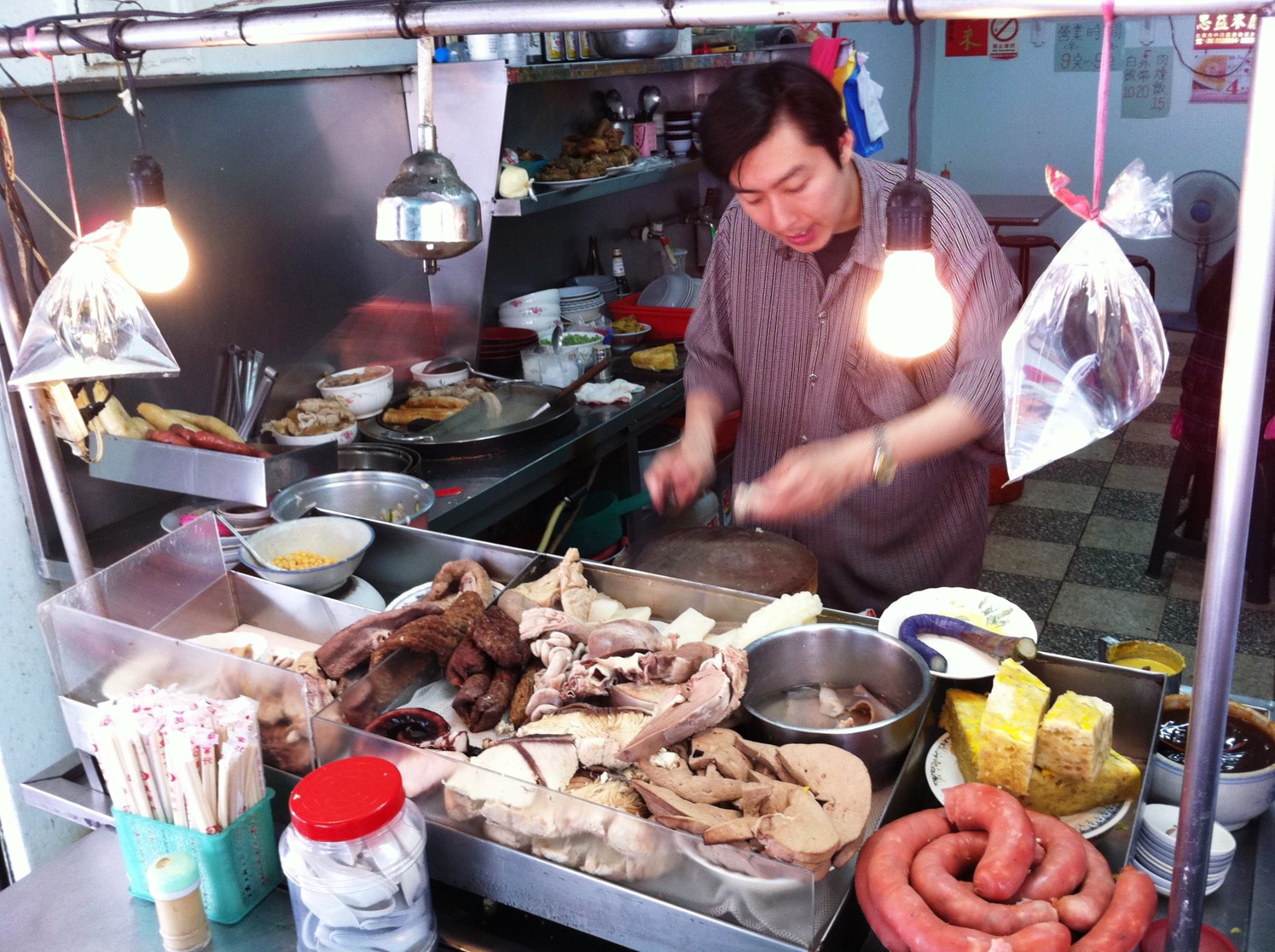 幾十年來的傳承演進,「香腸熟肉」依舊是眾多台南小吃中的王道,更增添了粉腸、大腸、小腸、豬舌、豬肺、蟳丸、菜頭、鯊魚皮、魚蛋、小肚、苦瓜、竹筍、三色蛋等食材。沾著醬油膏與哇沙米入口,舌尖和味蕾混雜著新鮮海味、香甜肉香和些許嗆鼻,再來一碗肉燥飯,體現追求幸福小確幸的執著,也展現台南人對「吃」的認真態度。台南運河旁的陳家、東門圓環的黃家、保安路和國華街口的阿龍都是不可錯過的攤頭。已經交棒到第三代的「阿龍香腸熟肉」,專注切著食材的老闆,長年工作到頸肩都略微傾斜,專注神情好似一座雕像。