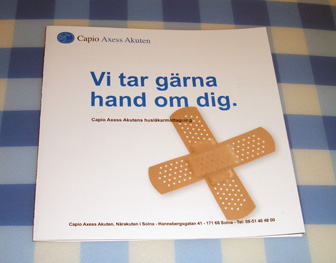 瑞典這邊的醫療系統跟台灣不太一樣,在台灣每人加入全民健保,不管是否看病與否每月固定繳健保費;在瑞典,國家保障人人享有全民健康保險(包含那些拿居留證的人),每月不必繳健保費,只在看病時才付掛號費,唯藥費也須自行負擔。