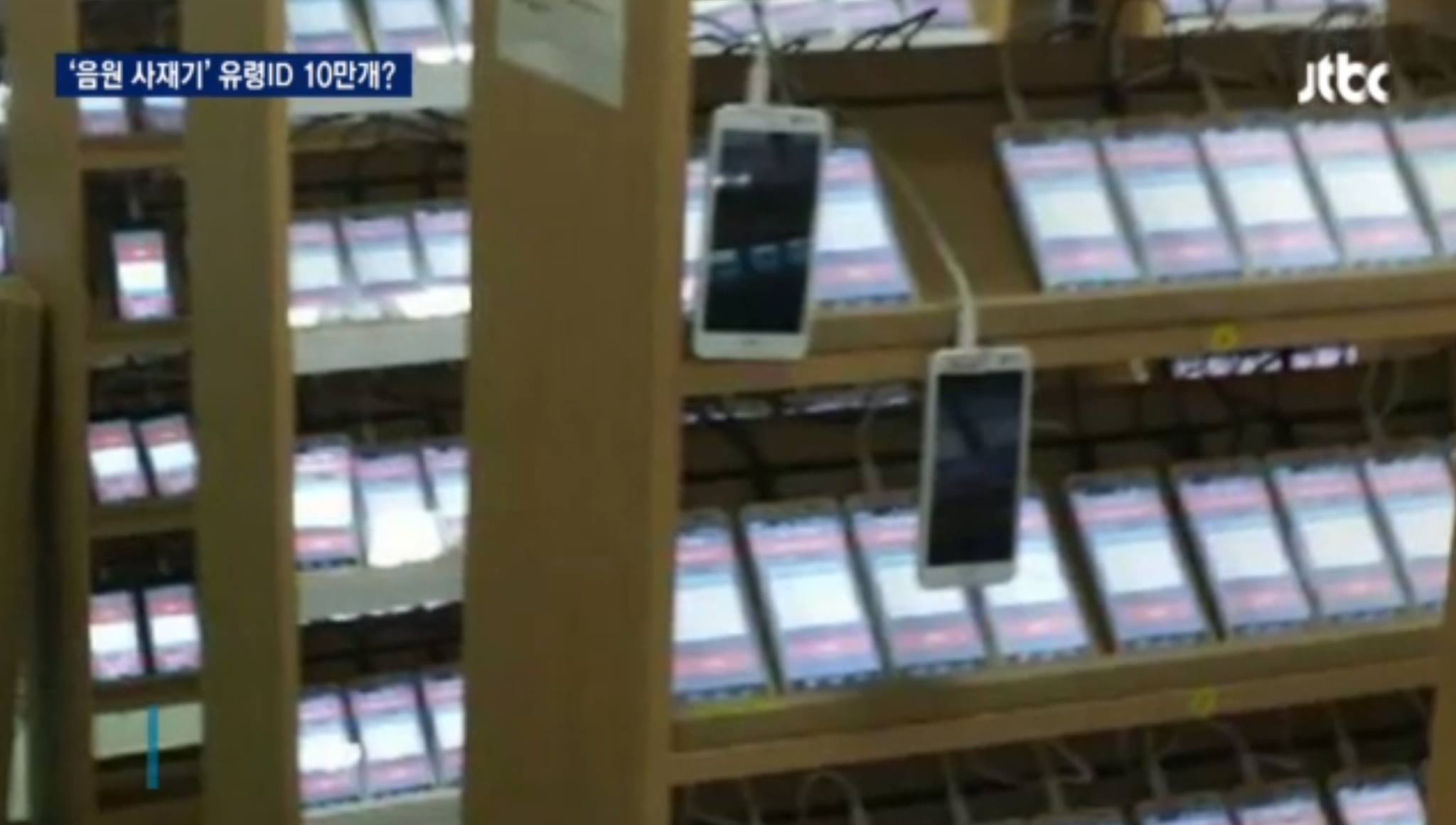 JTBC甚至公開藝能公司提供的照片:掮客在中國設立大型工廠,內部置物架上排放著數百千支手機,一同利用音源程式播送特定歌曲。