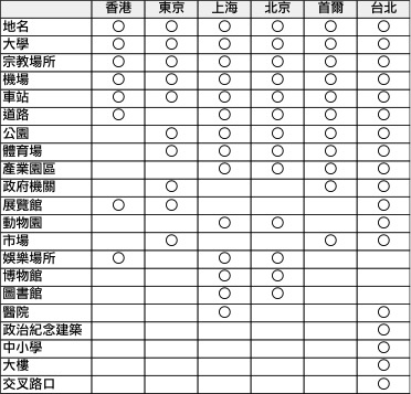 台北的捷運站名來源中,則有五種在東亞各大城市中可說是獨樹一幟:醫院(僅上海有一相同例子)、政治紀念建築、中小學、大樓、交叉路口。這些場所,是否全都具備足夠的知名度與正當性,以取代當地地名成為地鐵站名?