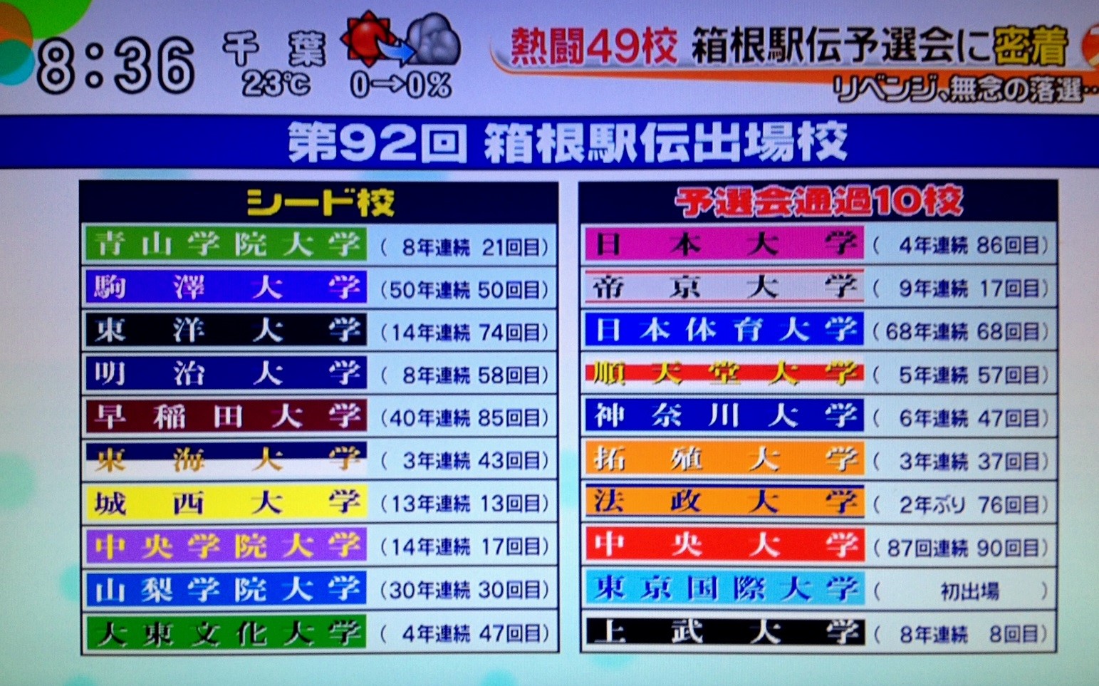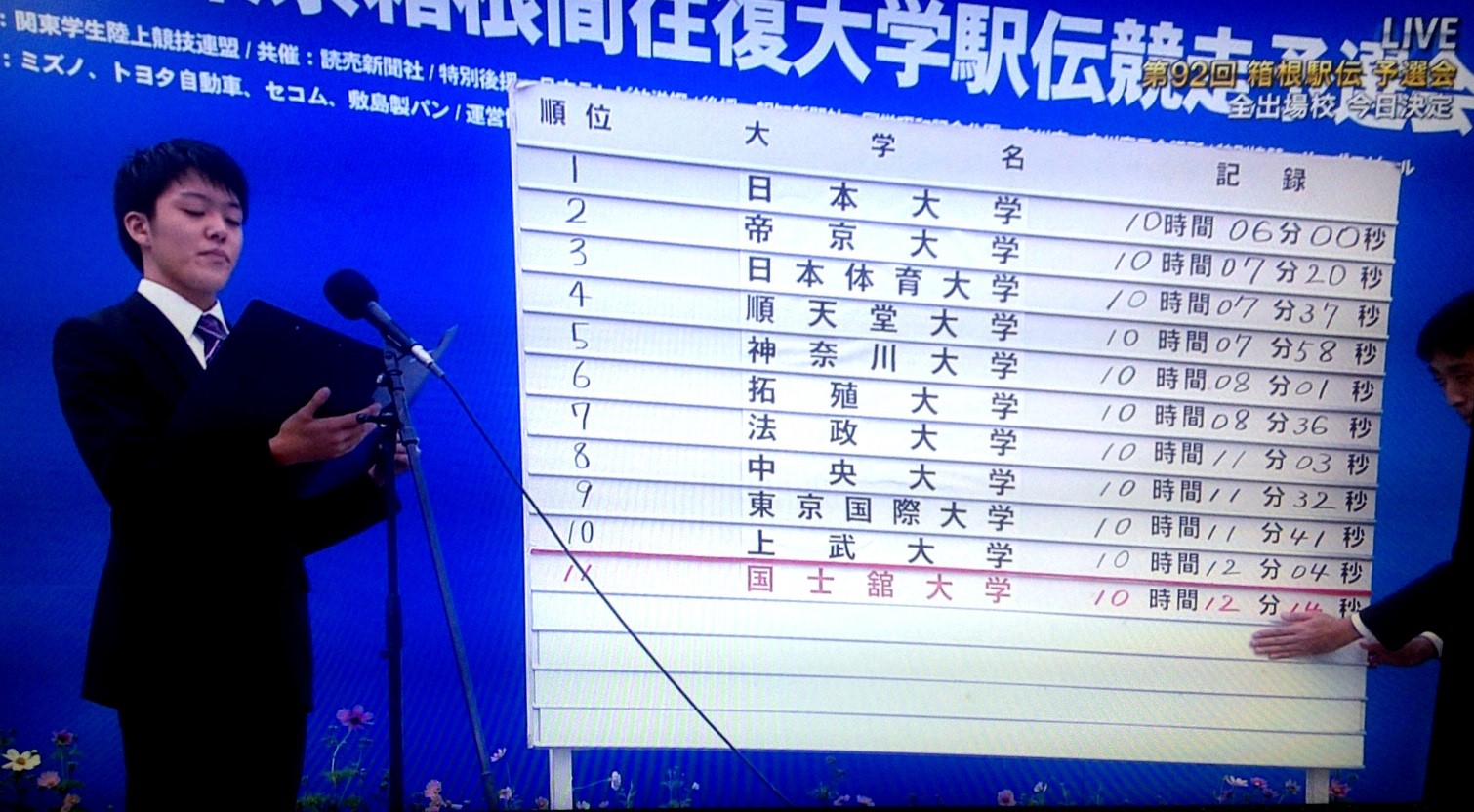 電視螢幕中,一群原本一臉愁容的男孩們,聽見了司儀喊出了他們的校名,爆出了歡呼與喜悅,又叫又跳,而鏡頭轉到另一群男孩,彷彿周遭的時間被凝結了一般,他們啞然的表情從還沒意會過來的恍惚,到咬著唇低下頭,最後默默地啜泣,不甘心的悵然彷彿也能感染到電視機前的我,這是10月18日早晨,箱根駅伝預選賽一景,只有成績最好的前十名,才能拿到明年正式賽事的入場資格。預選戰況激烈,第10名上武大學和第11名國士館大學僅差10秒,解說的主播下了一個殘忍卻實際的註解──「10名跑者,1人只要快1秒就能翻盤了。」日本元月時的箱根駅伝,每年都用淚水汗水交織出無數傳說,光是預賽,就已經足以瞥見其迷人刺激之處。