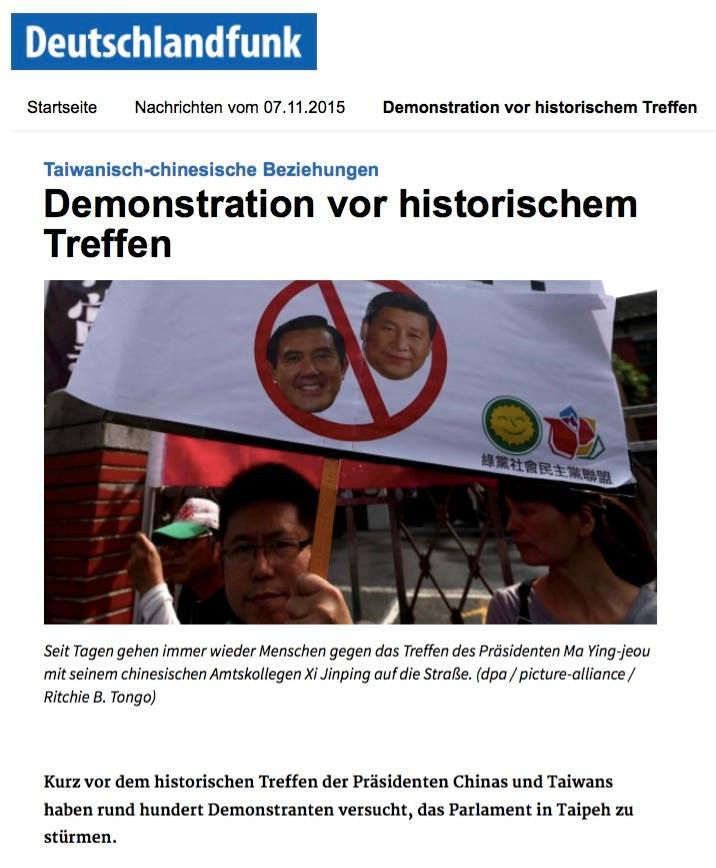 德國媒體今天在第一時間以顯著篇幅,報導兩岸領導人在新加坡的「歷史性」會晤,但也指出台灣民意並不支持兩岸走太近,馬習會對國民黨的選情可能會造成傷害。