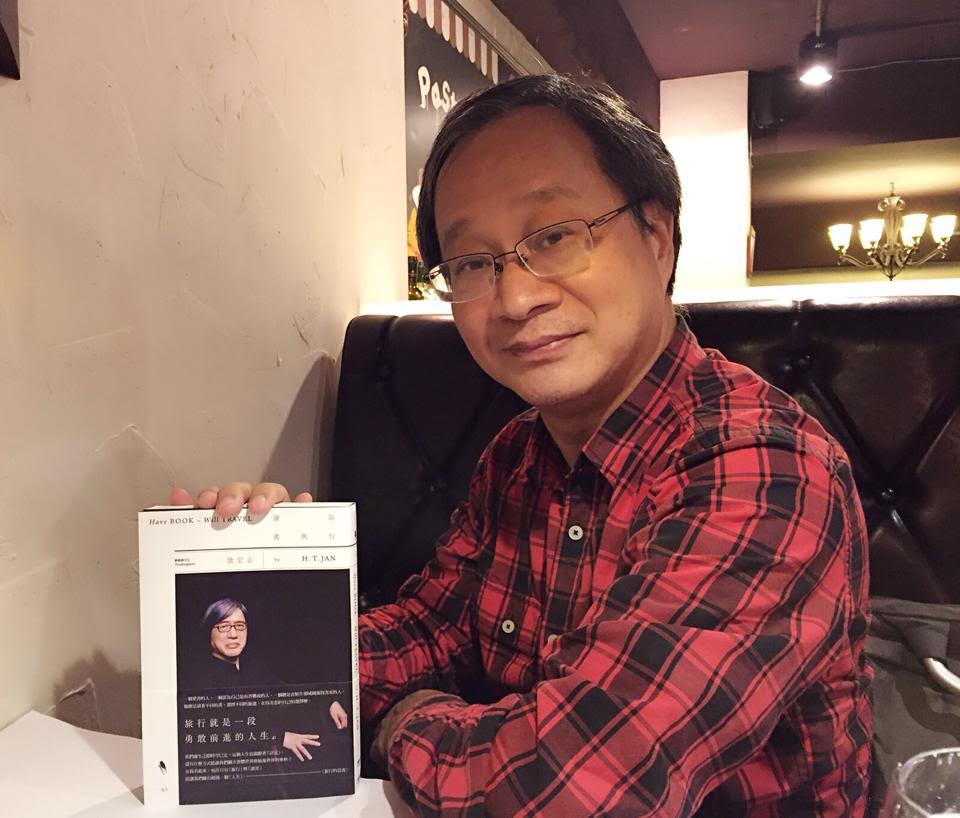 黃昏時刻,正在街道上等紅綠燈。發現一個老朋友的熟悉背影,拿著手機不知道在拍什麼。我迅速從背包掏出一本剛剛才買到手的新書「旅行與讀書」,故意衝向他,並且把書拿著說:「詹先生,我是你的讀者,請你簽個名。」