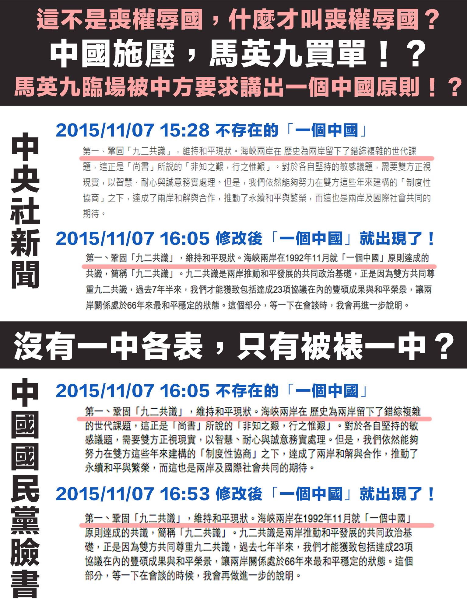 顯而易見,中央社和國民黨在馬習會前就取得馬英九致詞的原稿,所以中央社與國民黨臉書在馬英九致詞後就立刻刊登,只是與馬英九實際致詞內容有出入。馬英九在致詞時特別強調九二共識定義是「海峽兩岸在1992年11月就『一個中國』原則達成的共識,簡稱『九二共識』」。但是中央社與國民黨發布的馬英九致詞全文,卻和馬英九實際致詞內容不同,原稿並未提及九二共識是一個中國原則下達成的共識。中央社和國民黨臉書後來都分別修稿與撤稿(見下圖),國民黨重新上稿後,還特別又編輯一次註明來源是總統府網站。