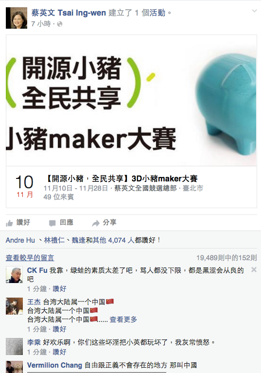 以上種種猜想都得先渡過網路言論市場動盪的階段,例如蔡英文粉專貼出的回應(註2),還有根基於臺灣人主導的社群媒體、新型平台經營,不會輸給「中國市場」的假設。別忘記,中國疑似解禁臉書的同時也是「光棍節」開賣,例如中國電子商務平台(天貓)的交易額在十二分鐘內超過一百億人民幣。