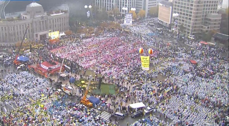 11月14日,首爾出現大型集會示威,八萬群眾走上街頭,對朴槿惠政府發出怒吼。人潮從市廳蔓延至光化門廣場,被喻為是2008年反對開放美牛的燭光示威後,南韓最大規模的街頭運動。