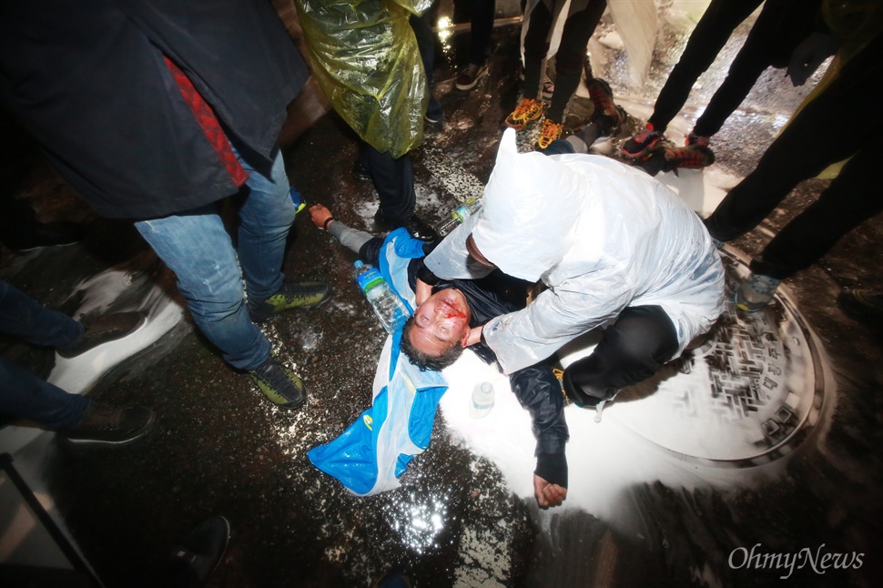 更有從全羅南道上京參與抗爭的68歲老先生,在試圖以繩索拉動阻擋示威者行進的警察巴士時,遭水柱朝正面噴射,倒臥在地,被一旁示威者發現,冒著同樣被水噴的危險,才把他給抬起來,此時他的口鼻皆出血,喪失意識。