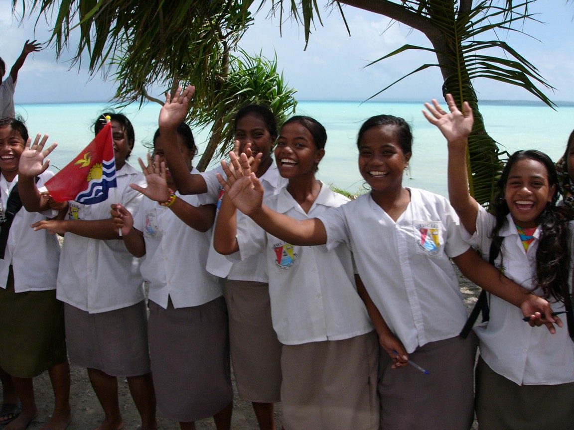 多年來,台灣提供這些南太平洋島國醫療、農耕、教育協助,台灣政府資助吉里巴斯蓋起一棟比立法院更富麗堂皇的國會大廈,吉里巴斯也擁有號稱全世界最美麗的夕陽和最多星星、沒有光害的夜空。位於赤道上,由32個環礁及1個珊瑚島組成,土地面積共810平方公里的吉里巴斯,小朋友們賣力跳著傳統迎賓舞蹈,唱著南島原住民的清亮歌曲,海水藍得好新天堂樂園,穿著整齊制服的學生們熱情有禮地揮著手,感謝來自台灣的溫暖愛心。