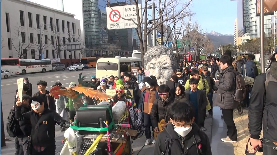 到了週六午後,集會浩浩蕩蕩在首爾都心登場。這次的參與人數約為40000人,是第一次集會的一半,也少了激烈的對決氣氛。