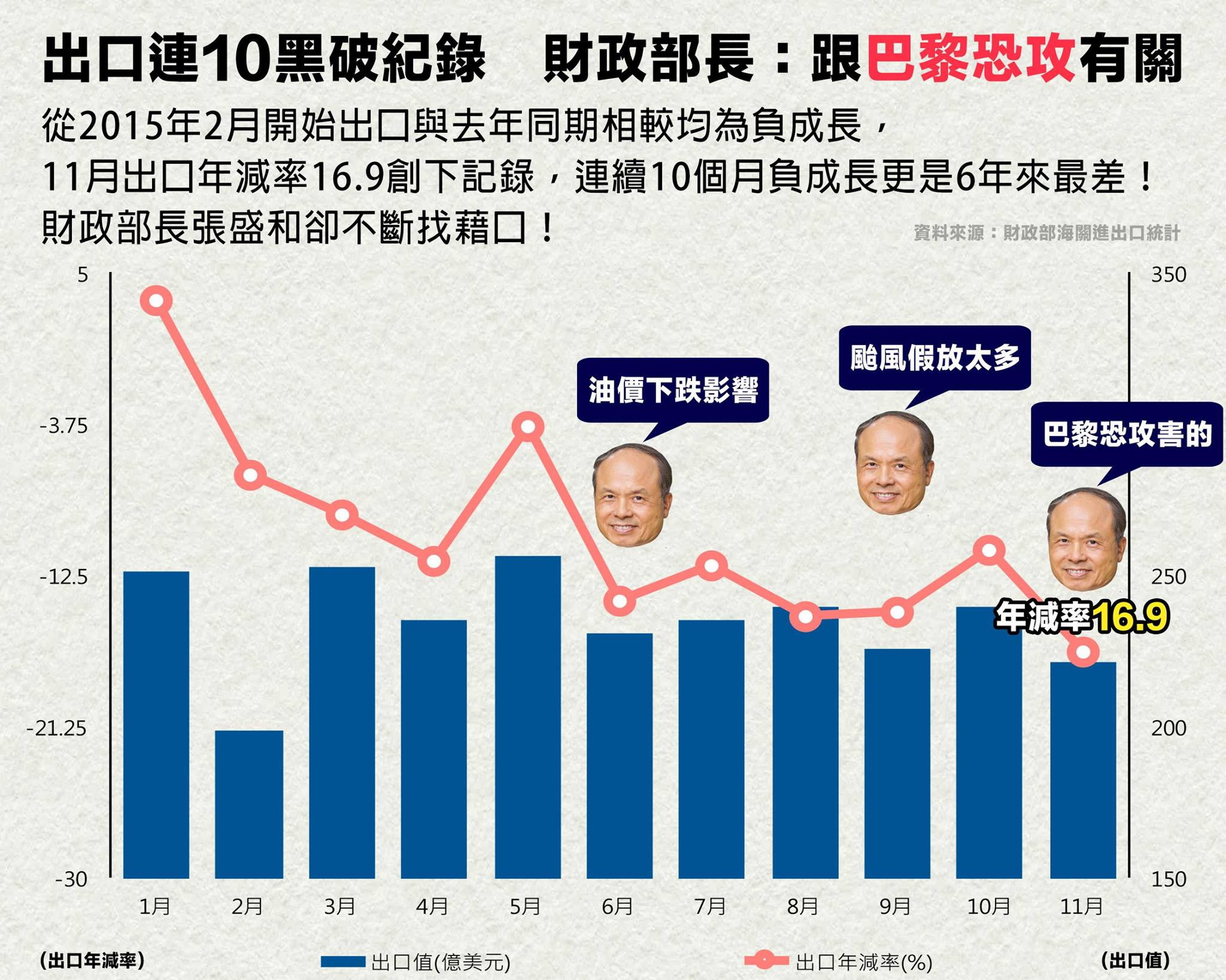 陳以信舉出各項數據質問民進黨:「當年綠執政時,哪一點做的比馬總統好?」我想,人民大概想質問國民黨執政哪一點比民進黨好。以受薪階級而言,國民黨執政後人民失業率比民進黨時期還高;實質月薪平均4.4萬,比民進黨執政時的4.7萬還低,實質年薪更是倒退回17年前。在貿易方面,財政部在12月7日公布每月出口額連10黑,年減達16.9%,毫無好轉跡象;不過財政部長張盛和卻是理由一堆,股市下跌、颱風假太多、巴黎恐怖攻擊等等均是藉口。其實,在國民黨上台之初,2008年9月起到2009年10月間,出口總值連14黑,其中2009年1月衰退44.1%,均創下史上最慘紀錄。目前離國民黨下台還有6個月,我想國民黨應該有機會打破連14黑記錄。