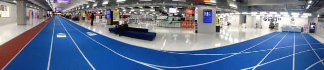 前陣子千葉縣的成田機場第三航廈興建完成,即使該航廈力求低成本,設計團隊仍舊發揮巧思,光是把從第二航廈到第三航廈的通道的視覺印象做成PU跑道,就已經話題十足。實際面,PU跑道輕易地藏住且保護到管線,外觀又特殊有趣,去程使用藍色,彷彿一條通往天際的空色之路;回程則是使用土色,給人落地後安心的踏實感,和新千歲機場的色溫調節亦有著異曲同工之妙。