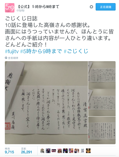 另一部日劇《朝五晚九》(5→9〜私に恋したお坊さん〜)中,最後一集演到男主角貼心地親筆寫信給女主角所有的親朋好友,那些信其實只出現了一幕,但看了官方的twitter才發現,那些信值得激賞的不只有用毛筆寫下的漂亮字跡,就連內容也都不一樣,這也讓我原本在看劇時,覺得這段頗矯情,在發現劇組如此用心後,反而開始自省自己的不細心,對這部日劇的評價再上升。