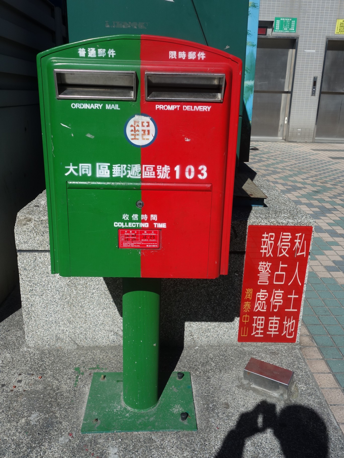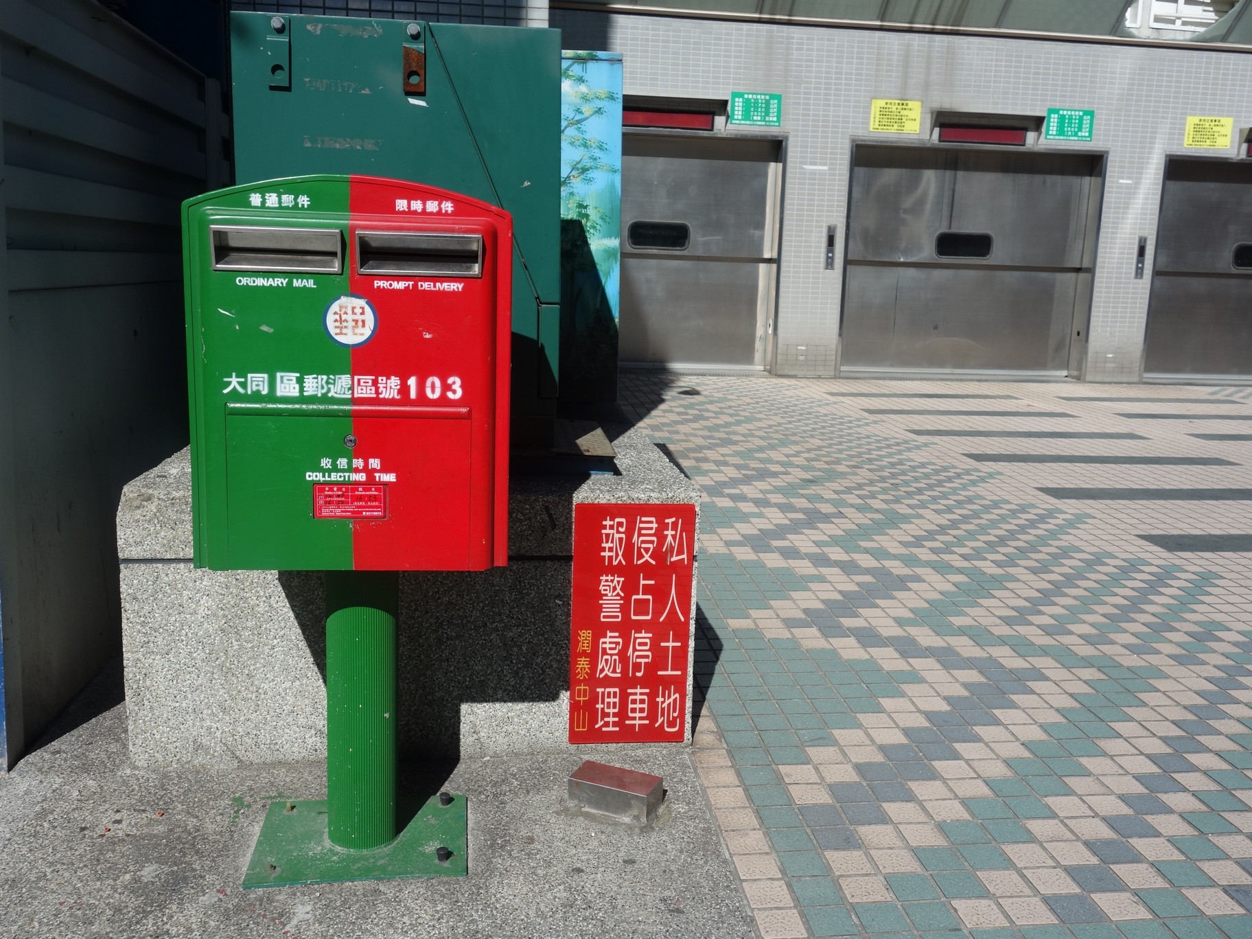 紅綠色的郵筒標示著信件不同的送抵速度,收件的時間也不同。大多的時候,你看到的都是並立的郵筒,不過,有一天,我注意到一個郵筒,非常特別,它就只是個單一存在,長方形的筒身區分成紅綠兩色塊,成了平信與限時航空合體。它的立意是經濟的,既然沒有這麼多信件,就不需那麼多郵筒,它的造型讓我想起一張畢卡索的人臉,一張臉由兩組線條組成,只是它更為工整,不像藝術那麼抽象和立體;它也讓我想起布袋戲中的一個人物,黑白郎君,善惡,喜怒,愛憎同在一身。發現這座郵筒是偶然的,那是有一天,我從腳踏車上摔出去,落下來的地方就是這座郵筒前,我後來路過時,都會停下腳步,想起那一天發生的事。台北市還有一處郵筒也讓我驚奇,一次路過同安街,發現馬路太小,街頭無法設置郵筒,就直接掛在人家的牆上。這對郵筒就更有意思了,像是裝置藝術,旁邊還有蔓生的綠葉。不過,在城南舊區,我相信它的使用率會較高,附近有幾家出版社,也住有許多學者和作家。