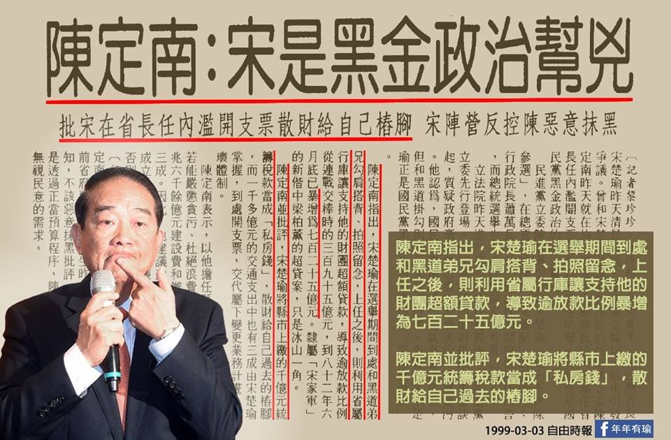 為了權力,宋楚瑜當年向李登輝靠攏,因此在1995年被邱毅、馮滬祥與新黨、新同盟會辱罵為外省人吳三桂。為了競逐總統大位,宋省長則是全省走透透到處做人情拉關係,這也是不少地方政治人物依然懷念宋省長的緣故;例如,時任台中縣議長的顏清標就曾經從宋省府爭取到1億1千餘萬元的省府統籌分配稅款。而且,宋楚瑜與黑金或弊案纏身者的關係也密不可分,例如,曾任宋楚瑜競選省長屏東後援會會長伍澤元涉及四汴頭弊案,宋楚瑜宜蘭縣競選總部主任委林榮星涉及正副議長賄選案,宋楚瑜桃園縣北區競選總部主任委員邱創良涉及關說圖利與超貸,宋楚瑜南投縣競選總部主任委員簡金卿也是關說圖利以及省農會賄選,宋楚瑜屏東競選總部執行長鄭太吉則是公然持槍殺人。擔任宋楚瑜2000年競選總統的總部主委,即前立法院院長劉松藩,目前則是因為廣三案逃亡中。坦白說,若要攤開宋楚瑜團隊黑金地圖,實在是族繁不及備載。
