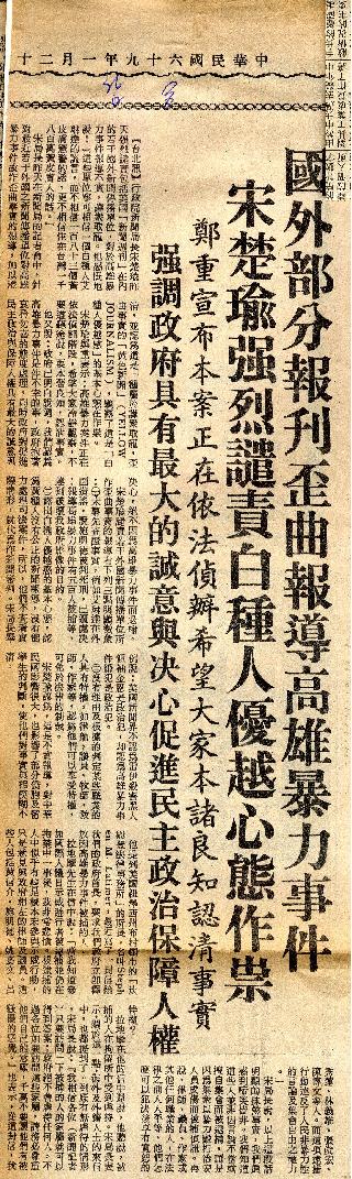 隔年,宋楚瑜對於美麗島事件繼續追殺外國媒體。宋楚瑜於1980年1月25日發表公開談話,強烈譴責《新聞週刊》歪曲美麗島事件事實。3月20日,宋楚瑜抨擊美聯社有關美麗島事件的報導,並揚言如果再不公正報導,將考慮中止其新聞來源。無獨有偶,當時在美國擔任《波士頓通訊》主編的馬英九,則是以社論痛斥美麗島事件「暴民」。