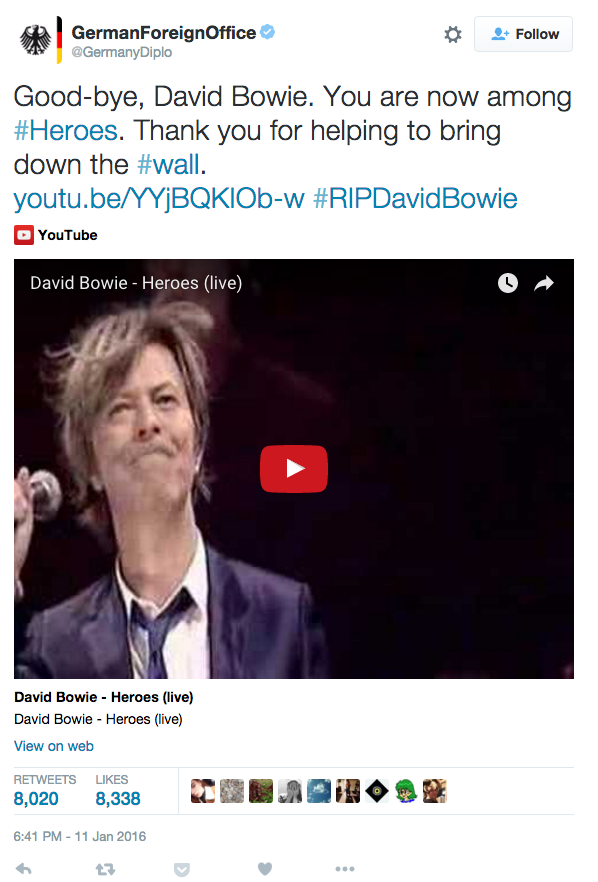這麼作雖然有點不敬,但黃安確實讓我想起最近以69歲辭世的傳奇歌手大衛鮑依(David Bowie)。黃安一輩子就作出那首難聽得不得了的爛歌,和近半世紀來橫跨多樣風格、甚至以跨性別形象風靡歌壇的鮑依,藝術成就當然是沒得比。但黃安為什麼讓人想起鮑依?源頭來自於鮑依逝世後,德國外交部在官方推特上感謝鮑依「為柏林圍牆的倒塌作出貢獻」。