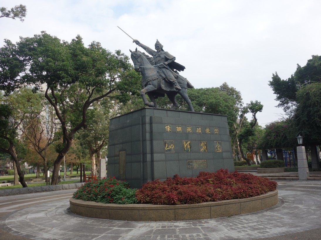 下午的時候,公園入口處會多了一個攤子,賣的是運動鞋,陽光下,花花綠綠的鞋子,像個台階,跳過一座滿是綠色草皮的公園,和不遠處熱鬧的街市呼應著。當然,下雨天的時候,公園裡沒有了運動的人,沒有了坐著輪椅曬太陽的老人,也沒有年輕的外籍看護工,只剩下一座高聳偉岸的岳武穆王雕像,雄踞公園,南面而威。