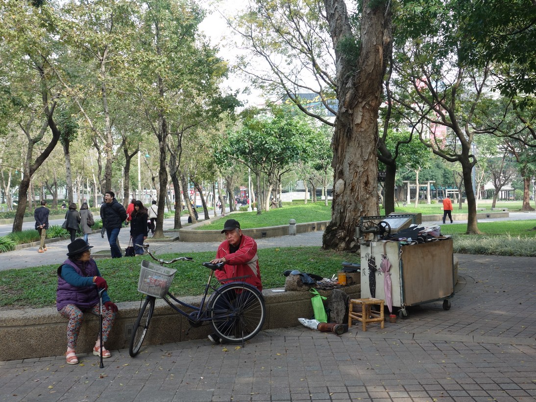 天氣好的時候,你會看到公園入口處,有一位老伯推著修理皮鞋的車子,在大樹下修理皮鞋,旁邊總會有二三個人陪伴、聊天,應該都是住在附近的人吧,我想。有時也看到有人拿鞋子來修理,不管是男鞋、女鞋,老伯都低頭辛勤地補綴。對於不修理皮鞋的我,不好意思走太近,覺得是一種冒犯。不管是鞋匠或顧客,都是些上了年紀的人,沒看過年輕人來修理皮鞋,也許,鞋子壞了,就直接丟掉了。