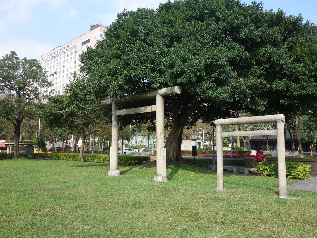 「還我河山」的背後,蘊含沉重不堪的時代悲劇,相反地,軍人的武德在這個年代好像是一種落伍的譏嘲,當退役的國軍將領跑到中國的果嶺上揮桿,一桿泯恩仇,反共也成了一種具有時代向度的反動修辭。不過,就公園本身的設置來說,設立銅像除了時代的宣示意義外,另一方面也和公園的前身有關。日治時代,這裡稱為三橋町,是一處公墓區,旁邊曾有極樂殯儀館,到了1949年之後,這裡又成了安置隨軍來台人員的暫居處,於1997年拆除,2003年建成了14號公園,林森公園。但這座岳武穆王銅像卻是在1979年由雕塑家蒲浩明先生所塑,據說設立銅像有一種安魂和鎮撫的目的,讓人靈具安。公園的北方邊區,還留有日治時代的第七任台灣總督明石元二郎舊墓址的大小兩座鳥居,小鳥居為其秘書官鎌田正威所有。我起先沒注意到這兩座鳥居,因為在不遠處的公園一角,也設了單槓數座。然而,公園裡終究還是留下一點過去的殘影,我在銅像旁的大樹先是與偶然出現的黑冠麻鷺對望,然後我又發現另一棵樹下的樹根處插著一措香腳,香腳上的紅漆仍新,想來是不久前才插入的,我閃過一陣疑惑,是誰在紀念誰呢?