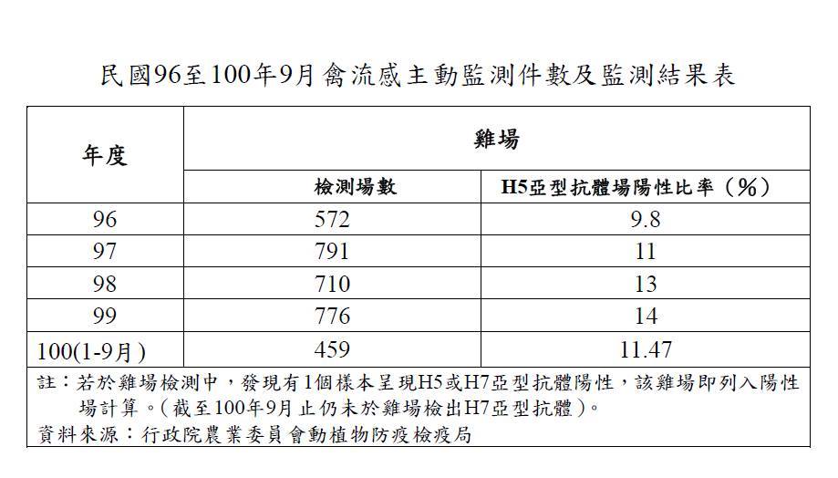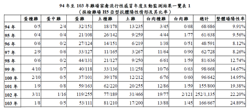 註1.94年至103年雞場家禽流行性感冒年度主動監測結果http://ai.gov.tw/index.php?id=970