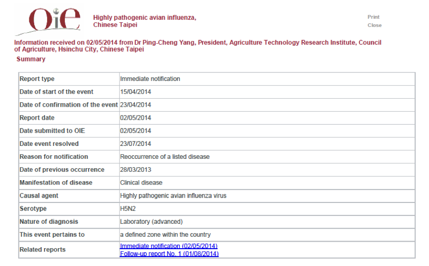 註2.Information received on 02/05/2014 from Dr Ping-Cheng Yang, President, Agriculture Technology Research Institute, Council of Agriculture, Hsinchu City, Chinese Taipeihttp://www.oie.int/wahis_2/public/wahid.php/Reviewreport/Review?page_refer=MapFullEventReport&reportid=15191