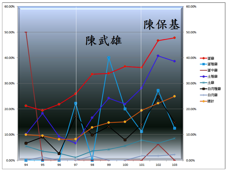 當我們把農委會公布的歷年禽流感抗體監測結果轉換成圖表之後,可以清楚看出101年禽流感疫情爆發,2月陳保基接任農委會主委,從101-103年的抗體監測結果(如上圖),可以看到整體的抗體陽性率顯著持續增加,而飼養期長的蛋雞、土種雞在陳保基任主委的第2、3年(102、103年)也出現抗體陽性率暴增的情況,顯示禽流感病毒更加擴散,是97年前的2倍陽性率,出現近5成蛋雞場被感染,這是讓病毒在地化的重要證據,整個防疫是徹底無能瀆職,同時也象徵整個防疫網完全瓦解,讓新型H5N2、H5N3、H5N8病毒在不到1個月內從南屏東到北桃園完全擴散台灣西部各縣市。