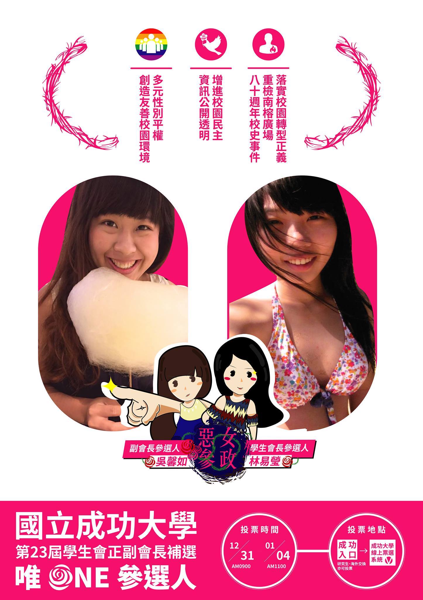 我的夥伴一直以來,長期在校園性別政策以及黑箱校長遴選程序問題耕耘。對我們而言,學生會長補選的尷尬任期既然無人願意接手,更有效而創新的利用,或許是藉由學生會,增加這些議題的能見度,畢竟,校方已經一年多來對黑箱校長遴選議題一再地迴避,將責任推回教育部,甚而一度鎖上校務會議議場大門,不讓反對派正式代表入內開會,造成推擠與學生代表受傷,作為成大代表的蘇慧貞校長,也從未對此事道歉或做任何的慰問。在這個脈絡下,我們決定成為這場學生會長補選的唯一候選人,而最具爭議的,是我們宣傳海報上我的比基尼照。