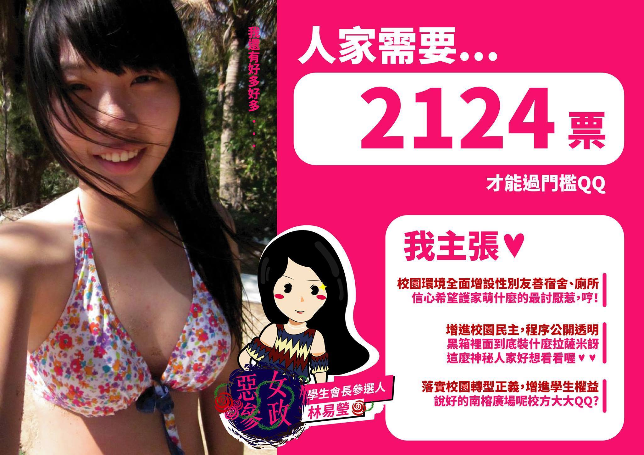 因此,我們發現,台灣整體社會的保守與去性化氛圍,竟成為壓迫性少數的正當理由。比基尼照不但沒有偏離政策主題,更是藉由引發爭議,直指性禁忌的問題核心:為什麼學校宿舍應該是去性的?為什麼公共議題的討論應該是去性的?為什麼政見海報應該「正經」,不應該有比基尼照?為什麼我們對政治的想像總是西裝革履的?這次學生會長補選既然我們定調為某程度的性平運動的延伸,比基尼宣傳照就不僅是宣傳,更是翻轉社會禁忌的重要策略。