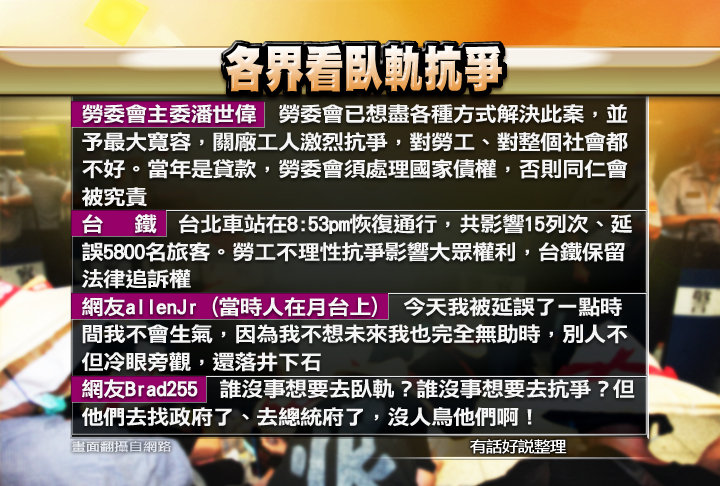 然而當一般公民與政治人物的生活秩序被打破時,也必然有人感到嚴重的失禮冒犯,希望回到原先的政治秩序,就像在月台上的一些旅客喊著:「拖走!拖走!」更甚者,有人斥責激烈抗爭不理性,政府則恐嚇說要以「公共危險罪」起訴抗議行動的主導者。