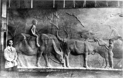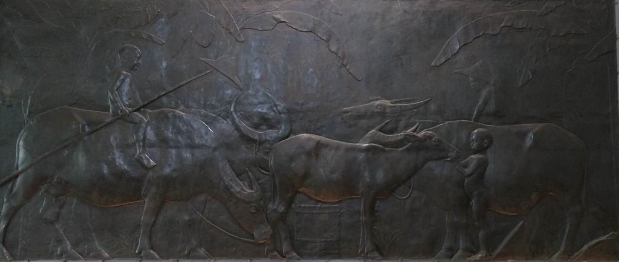 《水牛群像》,成為黃土水一生的代表作,然而這幅鉅作卻連展出都來不及。直到黃土水去世六年後,他的遺孀黃廖秋桂女士帶回台灣致贈給台北公會堂,也就是今日的台北中山堂,世人才能一睹鉅作。