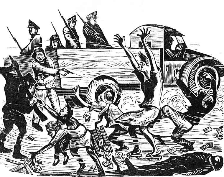 《恐怖的檢查》是二二八事件中最具代表性的藝術創作,畫中具體描繪寡婦林江邁販賣香菸遭到查緝鎮壓,寡婦的攤架被推倒,香菸掉了一地。查緝員開槍射向手無寸鐵的婦人,隨後還有四名持槍警察搭著卡車來到現場。版畫上寫實的場景,還原了二二八事件現場。版畫家用刻痕紀錄了這段血淚的歷史。