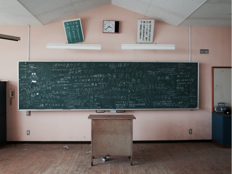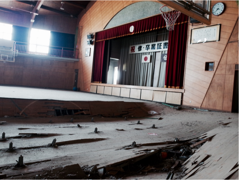 我記憶中的福島,無⼈的空城,更像⼀座⼤型⽚廠,鏡位⼀切都有點傾斜的廢墟。⼤約像是哥吉拉東京上陸之類的⽚⼦。畫⾯來得太快,無⼒形容。最驚⼈的或許不是空間,是時間。就在你發現⼩學校裡所有的時鐘都停在同⼀個時間的那⼀刻(這⼀幕很難不讓⼈聯想起⽇本攝影家東松照明的長崎原爆影像〈11時02分〉)。下午3點38分,那是海嘯來的時候,福島斷電失去了電⼒,福島第⼀核電廠失去反應爐。請⼾漁港邊的請⼾⼩學校,這裡距離福島第⼀核電廠只有五公⾥,海嘯在四⼗分鐘後抵達,國⼩禮堂的地板都變成了海波浪,非常寧靜⽽且完整地記憶了時間的所有形狀。