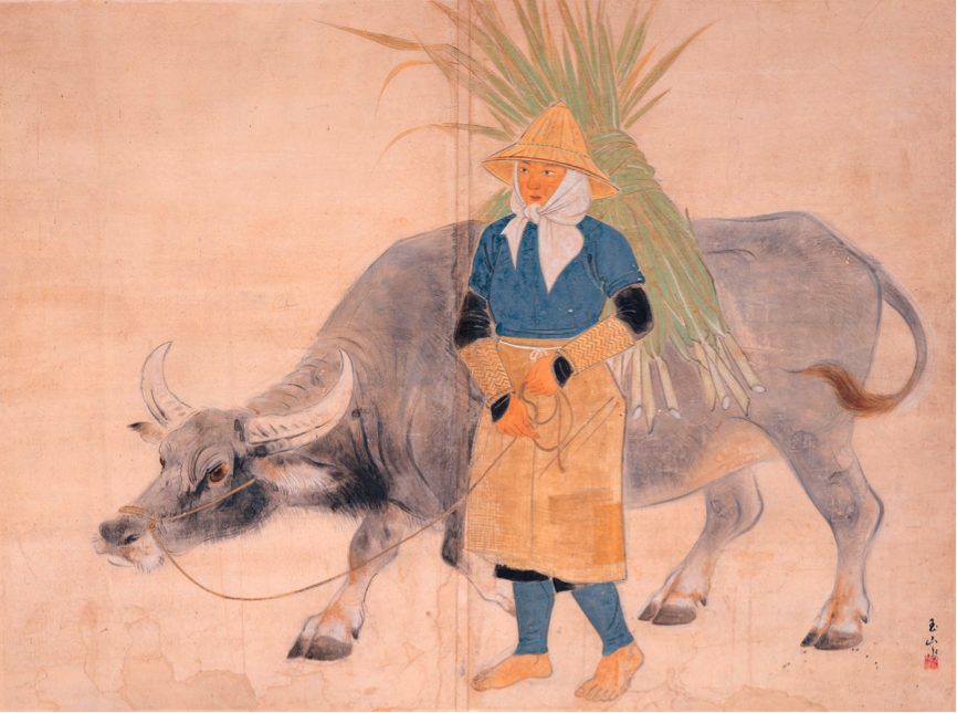 林玉山的作品充滿台灣意象,黃土水以《水牛群像》浮雕聞名,林玉山則以膠彩畫黃牛,以水墨畫水牛。牛,是農業時期台灣人的好朋友,用一生的勞力成就台灣這塊土地,林玉山畫台灣牛,表現台灣敦厚樸實的風土,堪稱一絕。