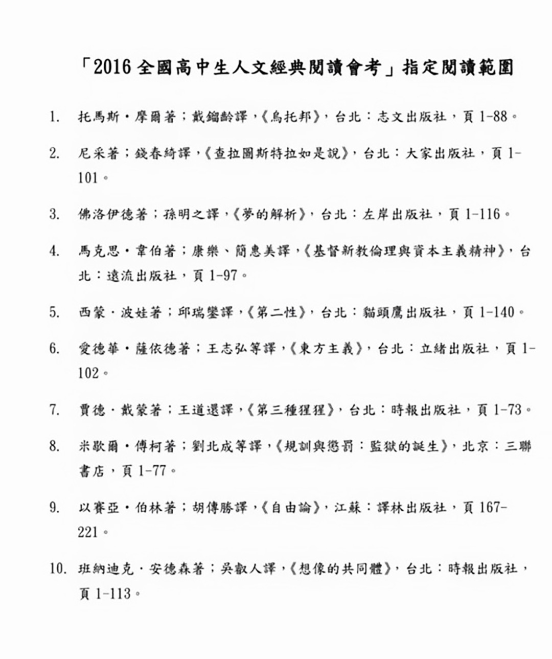 近日,台灣師範大學文學院「為提昇國人『人文素養』,並推廣閱讀習慣」,特地舉辦「2016全國高中生人文經典閱讀會考」,讓有意願的學校師生自由報名參加。會考開出指定閱讀書單,並欲仿照網路上熱議的「法國高中畢業會考」的哲學考題模式,分個人組以申論題答辯的方式進行競賽,以及團體組繳交書面報告與成果報告綜合演示進行評比。活動原本立意良善,卻不料經典書單不但引起各方對於高中生能否閱讀、理解經典的爭論,同時,對於經典閱讀與教學方法,以及台灣人文社科教育條件的討論也漸次開展。