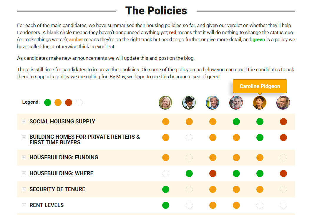 在這樣的原則與主張之下,Vote Homes 2016針對6位市長候選人的住宅競選政見進行分項總結評比,企圖提供倫敦市民作為市長選舉的投票參考。評比表中(詳下圖),空白表示沒有公布任何資訊,紅色代表沒任何改變作為(或更糟),黃色表示政見在正確的軌道方向上,但還需要進一步努力,或者更多資訊。綠色則代表呼應了該組織的期待,甚至有更積極突破的作為。