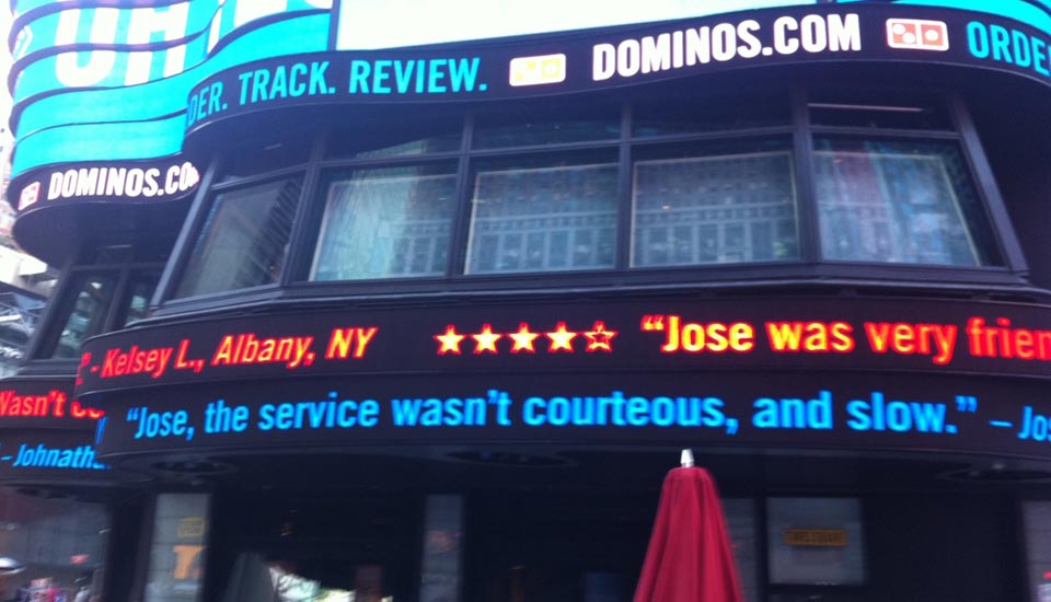 事實上在2011年7月,美國Domino Pizza已提前以類似flawsome的手法跨出新企業行銷第一步,在紐約時代廣場設置和該公司推特同步連動的電子看板,「現場轉播」消費者所有的推特留言,無論好或壞,時間長達一個月。其中不乏消費者留下「有夠難吃」、「服務不好」之類的留言。