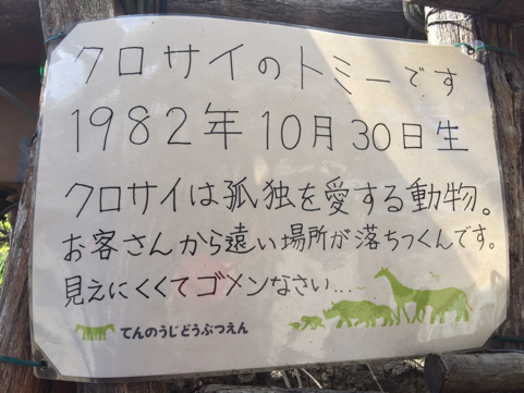 讓我們再把場景拉回天王寺動物園,這回走到黑犀的園地,只見牠倨傲地站在一角,完全不瞥任何遊客一眼,這回的告示變成「道歉啟示」,上面寫著,「黑犀牛Tommy,1982年10月30日出生。黑犀牛是享受孤獨的動物,在稍微遠離遊客的地方,比較能放輕鬆。如果因此比較難觀察到的話,還請見諒⋯⋯」,這篇說明文,若當成是Tommy的視角,好像也說得通,多多少少安慰到了被「疏遠」的受傷心靈,沒辦法,誰叫牠們天生孤冷,是該尊重牠們,多給一些空間。