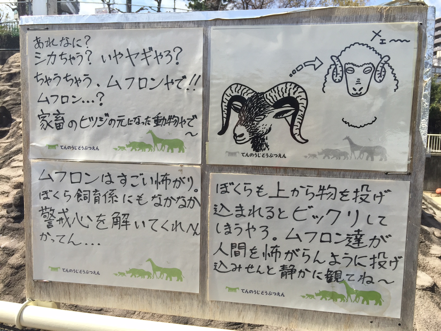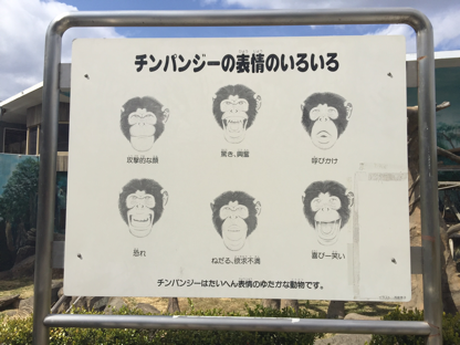 而走到一間野狼的櫥窗前,隔著玻璃的另一端是空的,看了告示才知道,原來這裡面本來住著一隻叫「幸」的野狼,在2016年3月16日過世了。2003年4月13日,幸在美國的Garlyn動物園出生,四歲的時候移民到天王寺動物園,園方評價牠是在爭執不斷的狼群中,不需要特別照顧、又乖又治癒的存在,很感謝旅客與牠一起相處的八年半歲月,「希望牠能和2011年3月時過世的福子(動物園中曾經飼養過的另一匹野狼)一起在天國幸福地生活」,窗前供奉著一束小白花。雖然和幸素未謀面,但看著看著心中也漾起一陣感慨與低落,不過,走到下個猩猩園區,又被表情圖解的告示惹笑了,園方認真描繪出猩猩在具有攻擊性、驚嚇興奮、或是欲求不滿時的表情。