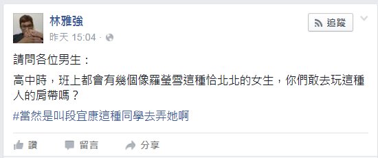 「肩帶」一文,就不太成功。「肩帶文」是訴諸女性、男性所共有,但並非雙方都愉快的成長經驗的一個推測。那個推測假定,閱聽眾的高中回憶裡,一定有像羅瑩雪那樣恰北北沒人敢招惹的女生;然後進一步假定,被推派去拉彈羅瑩雪「那種」女生胸罩肩帶的,一定是段宜康「那種」男同學。